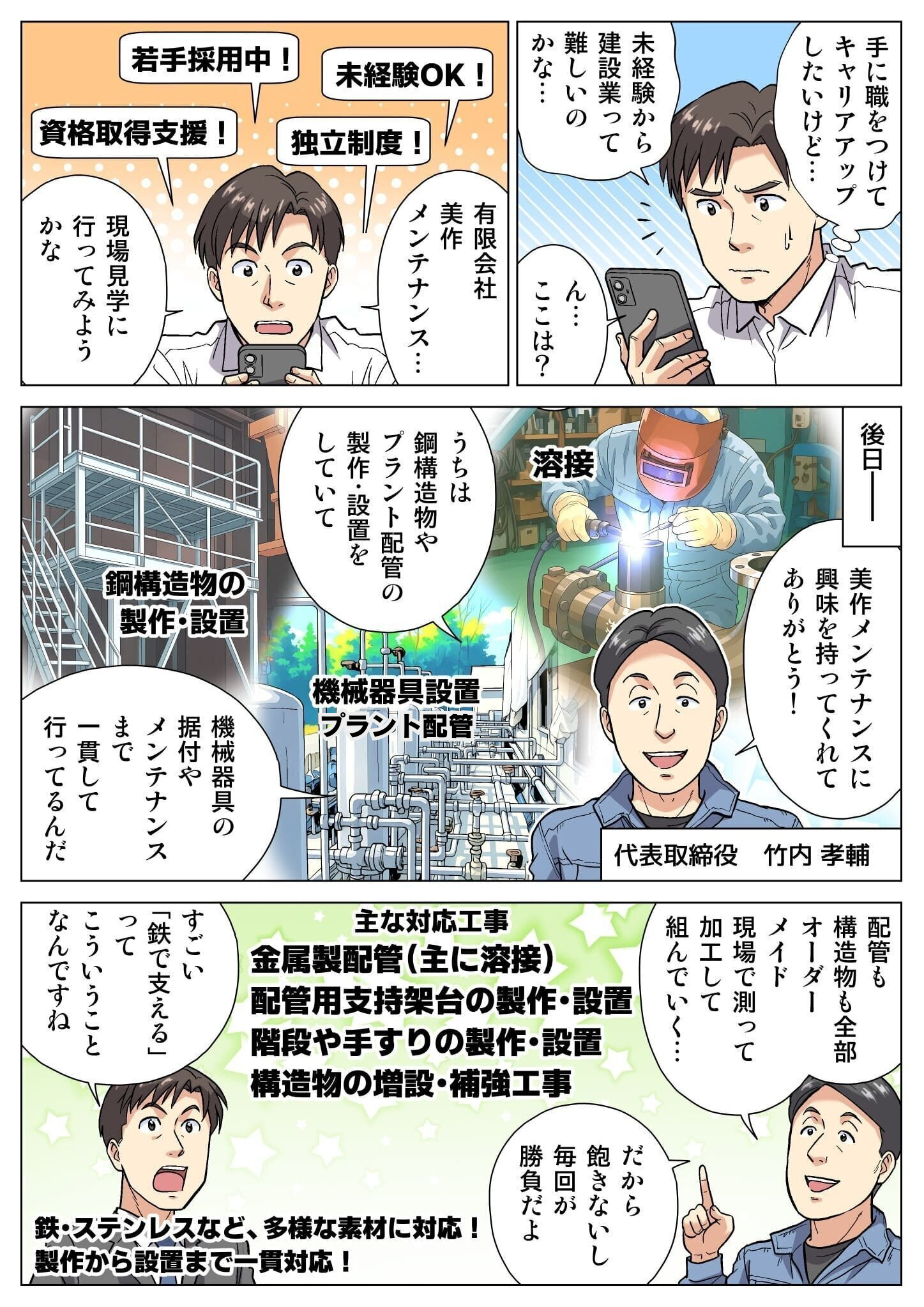 プラント設備に関する機械メンテナンスや各種配管工事の製作・取付作業、鉄やステンレスの加工・溶接を行います。Tig溶接を中心に、半自動・アーク溶接にも対応。現場への出張作業や2t・4tトラックの運転が発生する場合があります。